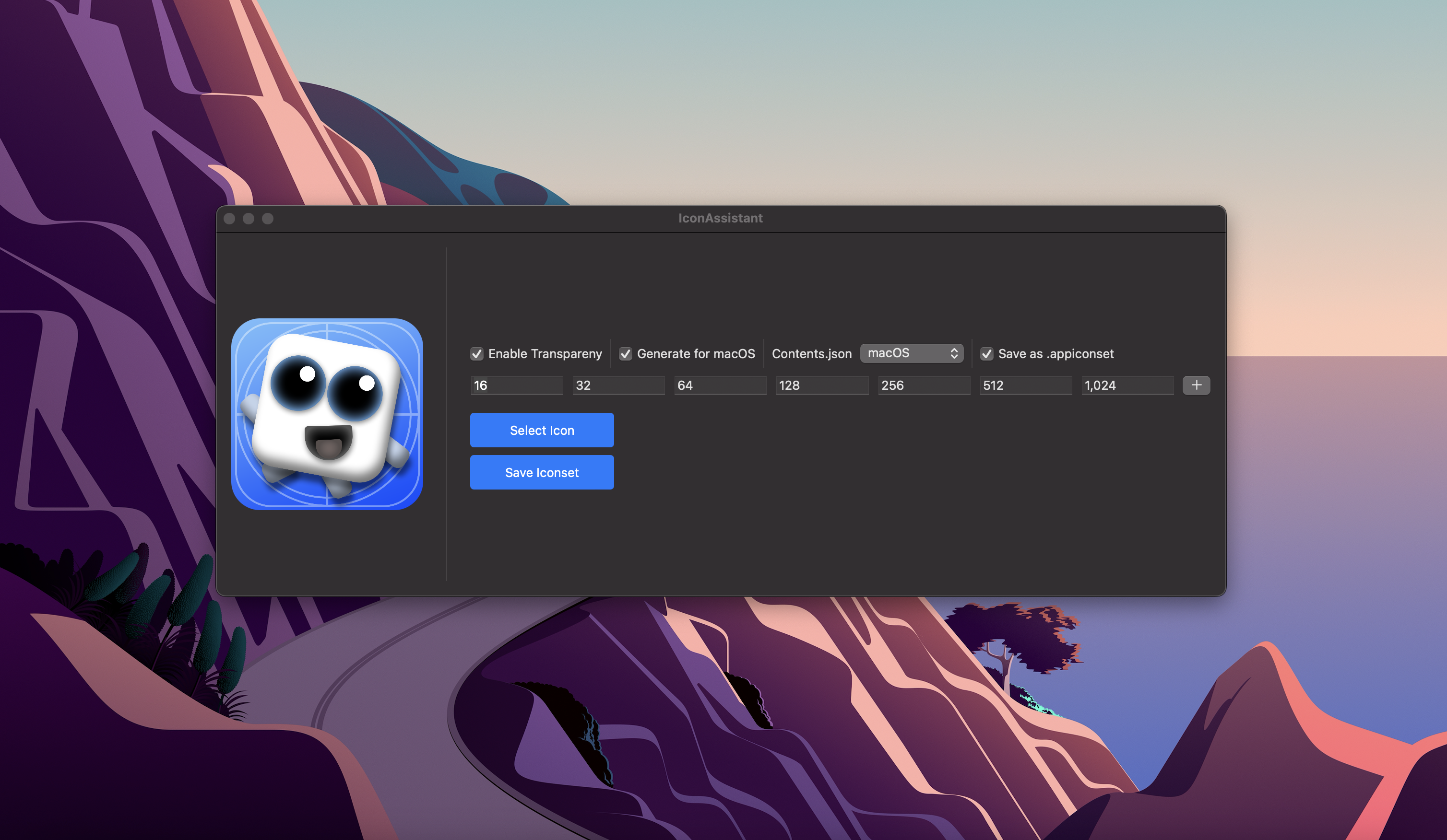 This app can generate your desired icon sizes, apply the proper scale and corner radius for macOS apps, toggle transparency, and even save as .appiconset with the included contents.json file.