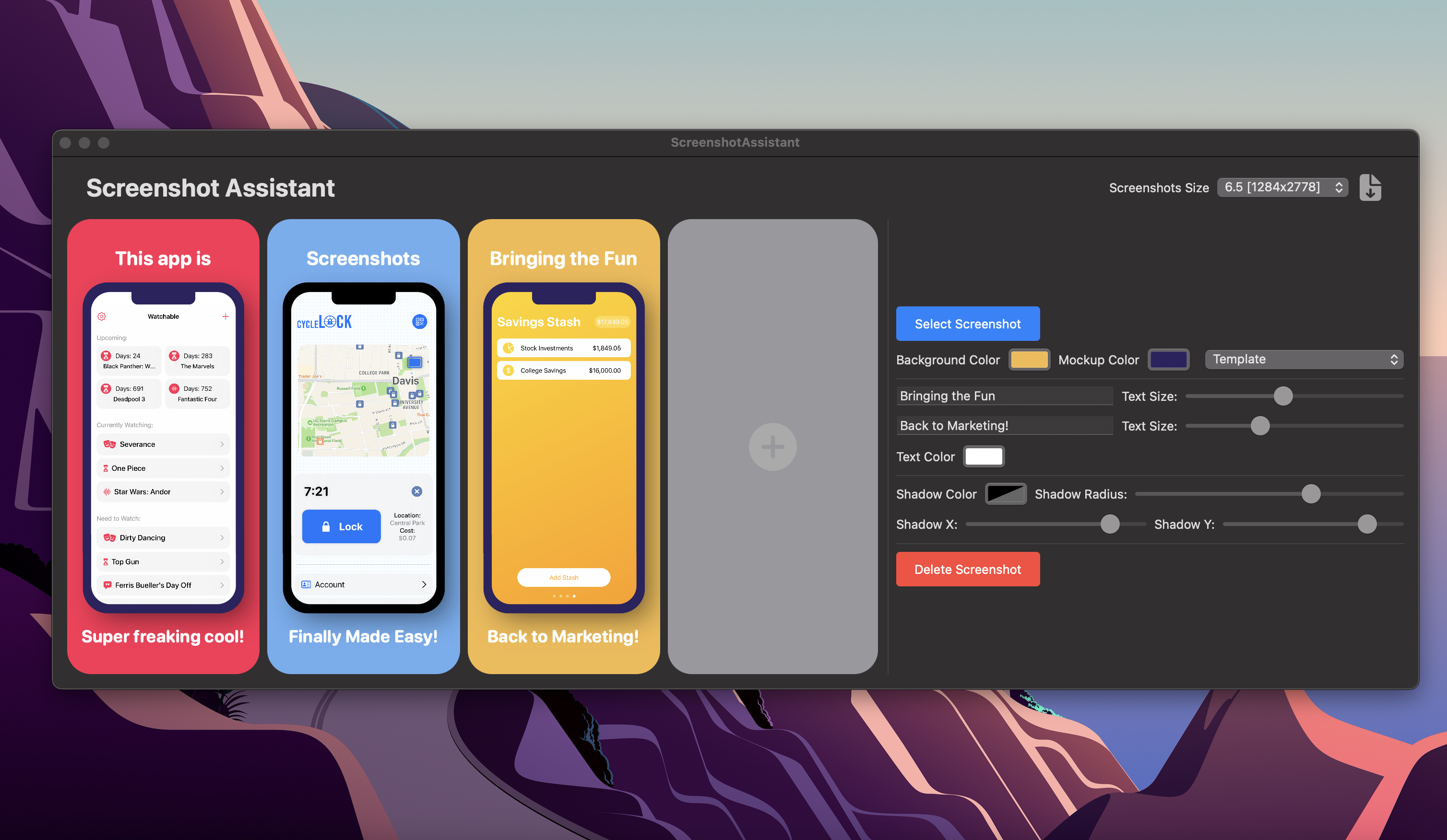 A Developer Tool for generating great looking promotional screenshots for the App Store. Simply Customize your Artwork, click the save button, and boom... a zipped file with all your perfectly generated screenshots for both 6.5" and 5.5" devices!